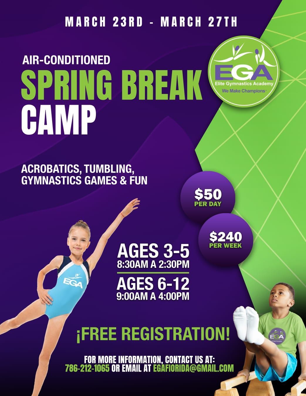EGA Gymnastics in Doral offers gymnastics classes for kids ages 3 & up, from recreational to competitive levels. Our safe and fun environment helps children build strength, confidence, and discipline while learning gymnastics.